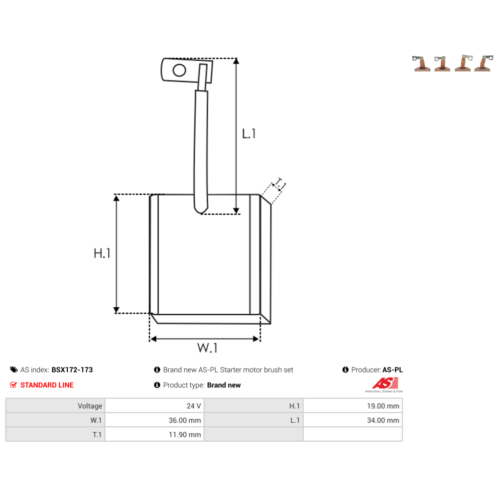 Основні характеристики Щітки стартера BSX172-173S (11.90*36.00*19.00) AS-PL